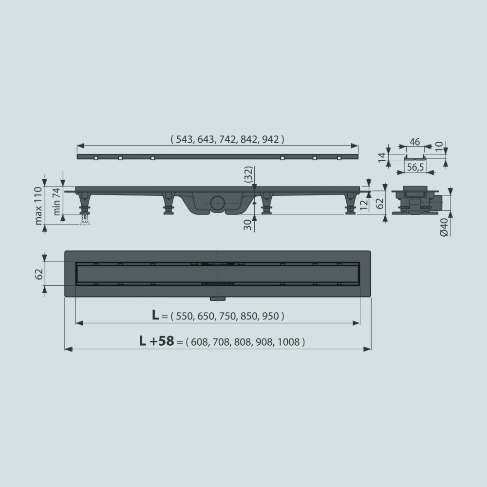 - Длина, мм: 550, 650, 750, 850, 950 мм