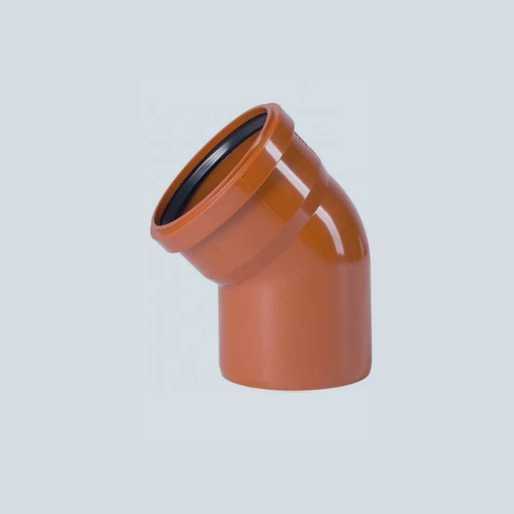 Отвод 45° — фасонный элемент для наружной канализации, предназначенный для изменения направления трубопровода под углом 45°. Используется при прокладке подземных сетей водоотведения для обхода препятствий, устройства поворотов трассы и подключения ответвлений.